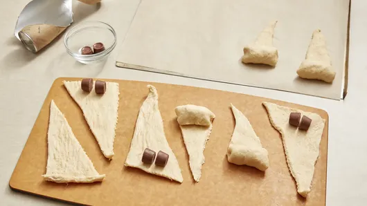 Step2Place 2 candies on shortest side of each triangle, and roll dough into ball to within 4 1/2 inches from opposite point; pinch openings to completely enclose candies. Turn over; place on cookie sheet.