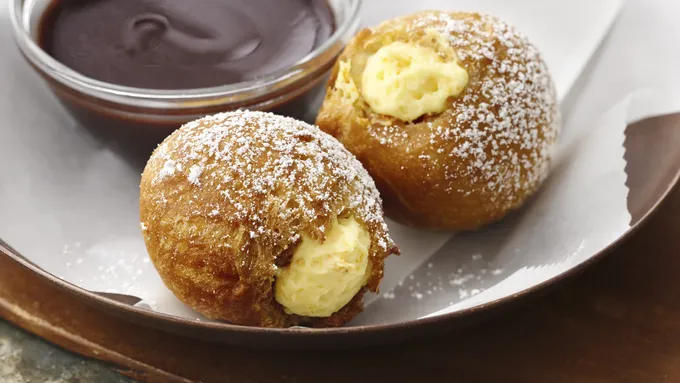 Step3To fill doughnuts, let filling stand at room temperature 5 minutes. Spoon pudding into decorating bag fitted with 1/2-inch wide tip. Insert tip into side of each biscuit. Squeeze about 2 tablespoons pudding mixture into center.