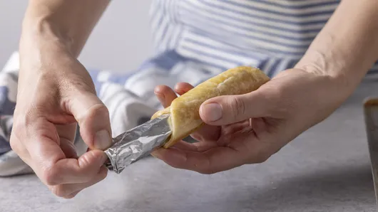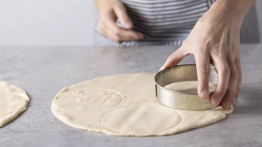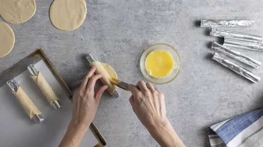 Roll each pastry circle around a foil tube; seal connecting edges with egg wash. Freeze for 10 minutes. Bake in a 425°F oven on a parchment-lined cookie sheet, then slide the foil tubes out of the pastry while it’s still warm.