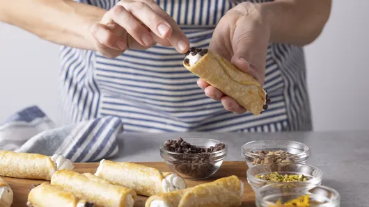 If you’d like to move into special occasion or gift mode, try dipping one end of the baked cannoli shells into melted chocolate. Then sprinkle with finely chopped nuts for a little extra crunch. Allow them to dry on a cooling rack before piping in the filling.