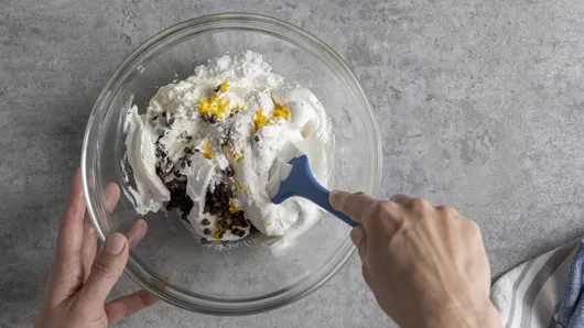 Combine the whipped cream cheese and whipped topping together with powdered sugar, orange zest, vanilla, and mini chocolate chips with a rubber spatula or mixing spoon until well blended. To ensure a very creamy base for the cannoli filling, our recipe calls for whipped cream cheese mixed with whipped topping. The cream cheese offers a similar tang to mascarpone, a higher fat fresh Italian cheese. A full-fat ricotta cheese is more traditional but has more texture—it’s a matter of taste as to which you choose.