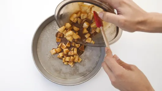 Step2In small bowl, mix caramel topping, melted butter and cinnamon until well blended; stir in apples. Spoon mixture evenly into pan.