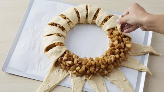 Step6Bring each dough triangle up over apple mixture, tucking dough under bottom of dough to secure it. Repeat around ring until entire filling is enclosed (some filling might show a little).