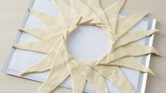 Step4Unroll both cans of dough; separate into 16 triangles. On cookie sheet, arrange triangles in ring so short sides of triangles form 6-inch circle in center. Dough will overlap. Dough ring should look like the sun.