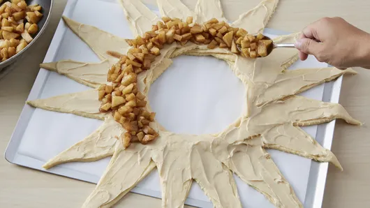 Step5Spread cream cheese mixture on triangles. Spoon apple mixture evenly over cream cheese on the half of each triangle closest to center of ring.