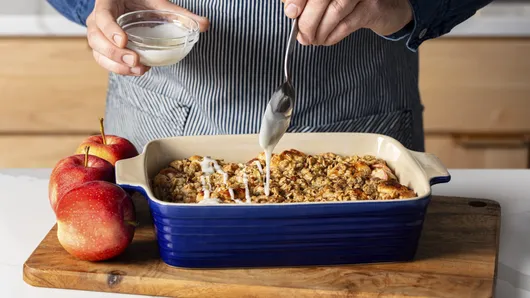 For the very best results, avoid serving your Caramel Apple Crisp Bubble-Up Bake when it’s just out of the oven. Let your creation sit for 10 minutes, then drizzle with gooey caramel and sweet frosting. This dish is delightful on its own, but we’re certain no one will say no to a dollop of whipped topping or a scoop of vanilla ice cream.