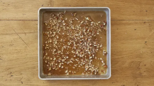 Step1Heat oven to 350°F. In ungreased 9-inch square pan, mix brown sugar and melted butter. Sprinkle with pecans.