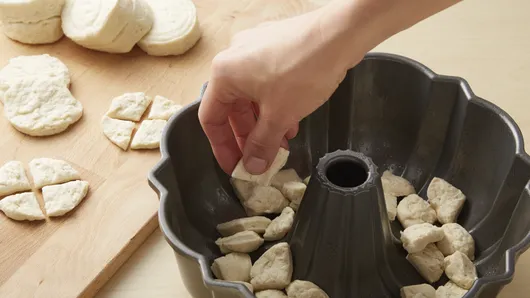 Step1Heat oven to 350°F. Spray 12-cup star-shaped fluted tube cake pan with cooking spray. Separate each can of dough into 10 biscuits; cut each biscuit into quarters.