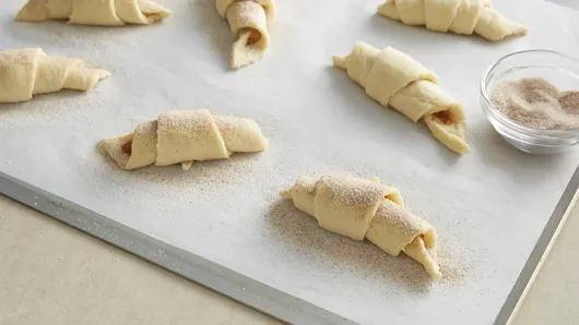 Step3Roll each crescent up, and place on cookie sheet, leaving tips straight. Sprinkle each crescent with cinnamon sugar. Bake 13 to 14 minutes or until golden brown.