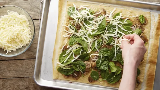Spread mushroom mixture evenly over dough. Top with spinach, mozzarella cheese and Parmesan cheese. Bake 5 to 9 minutes or until crust is golden brown and cheese is melted.