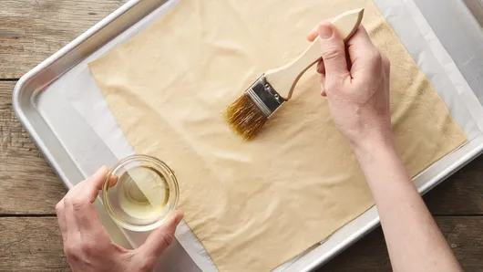 Unroll dough on pan; starting at center, press dough into 15x10-inch rectangle. Brush with olive oil. Bake 8 minutes.