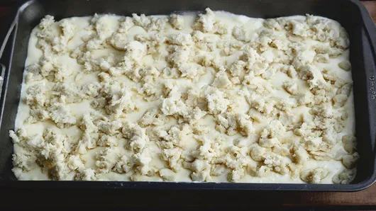 Step2In medium bowl, beat together cake mix, butter and 1 of the eggs. Press evenly in bottom of pan.