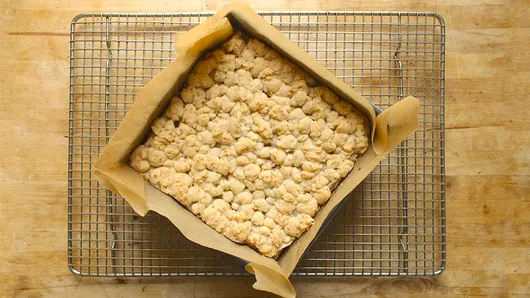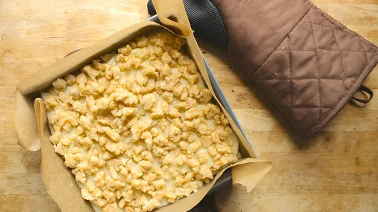 Step5Spread apple mixture evenly over crust in baking dish; top with remaining cookie dough mixture. Bake about 40 minutes or until top is light golden brown.
