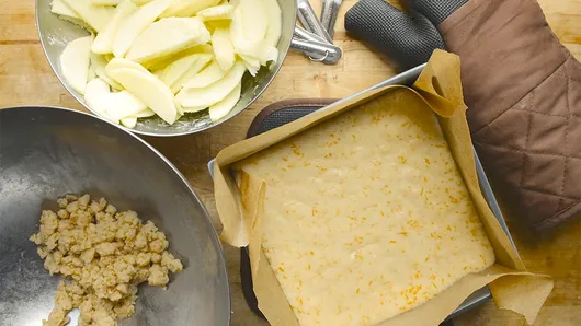 Step4Meanwhile, peel and thinly slice 2 large Granny Smith apples. In medium bowl, toss apples with 2 tablespoons all-purpose flour and 2 tablespoons granulated sugar. To remaining cookie dough mixture, add 1/4 cup all-purpose flour and 1 tablespoon sugar; combine with pastry blender. (DO NOT EAT RAW COOKIE DOUGH AFTER COMBINING WITH FLOUR.)