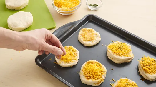 Step2Separate dough into 8 biscuits. Separate each biscuit into 2 layers. Place 8 biscuit pieces on ungreased cookie sheet; brush with butter mixture. Sprinkle each with about 2 teaspoons Cheddar cheese. Top each biscuit with remaining biscuit layers. Brush with butter mixture; sprinkle with remaining Cheddar cheese and parsley flakes.