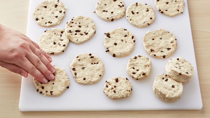 Step2Separate dough into 8 biscuits. Split each biscuit in half to make 16 biscuit rounds. Press each biscuit into 3-inch round.