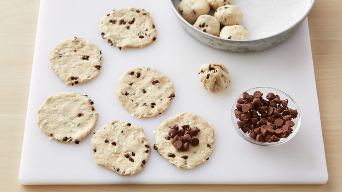 Step3Place 1 rounded teaspoonful chocolate chips in center of each dough round. Wrap dough around chocolate chips, pressing edges to seal. Place seam side down in pan in single layer, spacing apart.