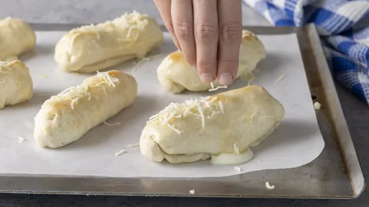 Cheese leaking out from the inside of the breadsticks can leave you with a hollow breadstick and a mess to clean up on your baking sheet. To help prevent leaking, it’s important to securely wrap and seal the cheese sticks inside the dough. Fold the dough over the cheese stick, firmly pinch the dough along the seam and on the ends to seal. Then, roll the breadsticks to smooth out the dough.