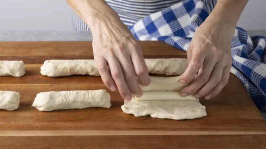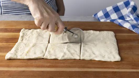 Cut the dough in half, then crosswise into six rectangles. A pizza cutter, kitchen shears, or sharp knife all work well to cut the dough.