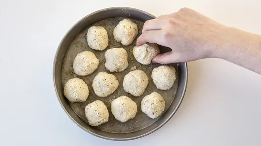 Step2Separate dough into 12 biscuits; flatten each into 2 1/2-inch round. Place 1 cheese cube in center of each biscuit round. Bring dough up around cheese cube; press edges to seal; shape into ball. Roll in butter, then in Parmesan cheese mixture. Place seam-side down 1/4 inch apart in pan.