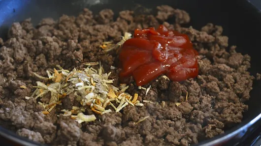 Step2Add soup mix, ketchup and water to beef; cook and stir until mixture comes to a boil. Reduce heat to low; simmer 5 minutes.