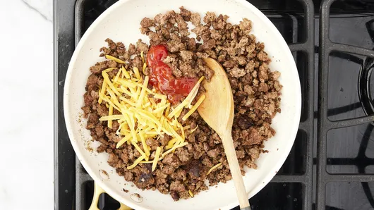 Step2In 10-inch nonstick skillet, cook beef over medium-high heat 5 to 7 minutes, stirring frequently, until thoroughly cooked; drain. Stir in shredded cheese and ketchup. Set aside.