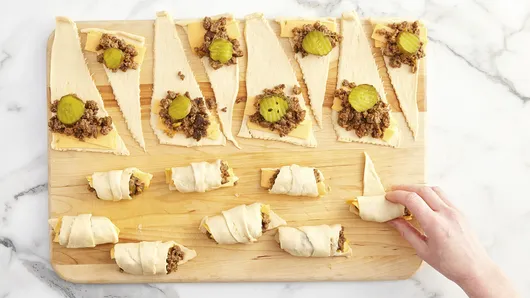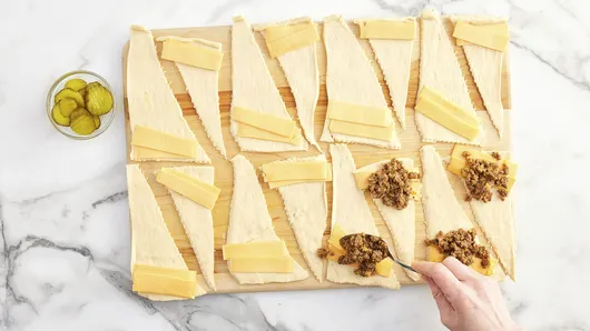 Step3Unroll both cans of dough; separate into 16 triangles. Place 2 strips of cheese on top of each triangle. Top each with about 2 1/2 tablespoons of the beef mixture and 1 pickle slice.