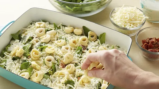 Step2In medium bowl, mix Alfredo sauce and water. Arrange half of the frozen tortellini in single layer in baking dish; top with 1/4 cup of the bacon, half of the spinach, half of the Alfredo sauce mixture and 1 cup of the mozzarella cheese. Repeat layers. Top with remaining 2 tablespoons bacon.