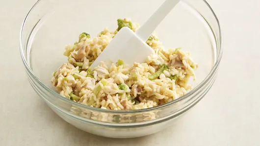 Step2In medium bowl, mix rice & broccoli, chicken and Monterey Jack cheese.