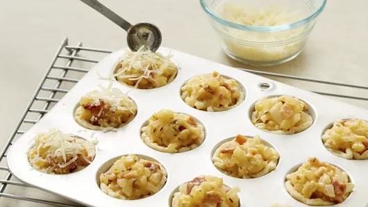 Step4Spoon about 1 tablespoon cauliflower mixture into each cup; sprinkle each with 1/2 teaspoon of the Parmesan cheese.