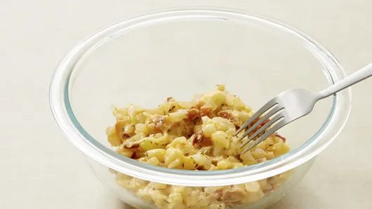 Step2Meanwhile, microwave frozen cauliflower as directed on box. Add cauliflower, bacon, 1/4 cup of the Parmesan cheese, the thyme, 1/4 teaspoon salt and 1/4 teaspoon pepper to the onion; mix well, breaking up any large pieces of cauliflower with fork.