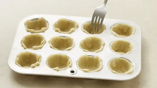 Step3Unroll pie crusts on work surface. Using 2 1/2-inch round cutter, cut 12 rounds from each pie crust. Press 1 round in bottom and up side of each of 24 ungreased mini muffin cups; prick bottoms with fork. Bake 8 minutes.