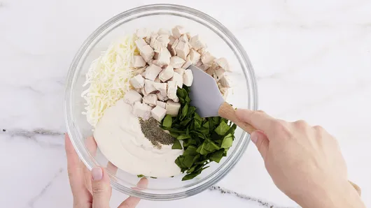 Step1Heat oven to 350°F. Spray 16 nonstick regular-size muffin cups (2 3/4 x 1 1/4-inch) with cooking spray; set aside. In medium bowl, mix chicken, 1 cup of the cheese, the spinach, Alfredo sauce and 1/4 teaspoon pepper; set aside.