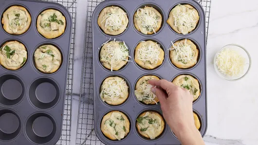 Step3Bake 17 minutes; top each evenly with remaining cheese. Bake 2 to 5 minutes longer or until biscuits are deep golden brown and cheese is melted. With thin metal spatula or sharp knife, gently loosen around edges to remove biscuit cups from pan.