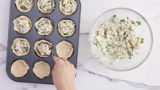 Step2Separate dough into 8 biscuits; carefully separate each biscuit into 2 thin rounds to make 16 rounds. Firmly press 1 biscuit round in bottom and up side of each muffin cup, forming 1/4-inch rim. Spoon chicken mixture evenly into biscuit cups.