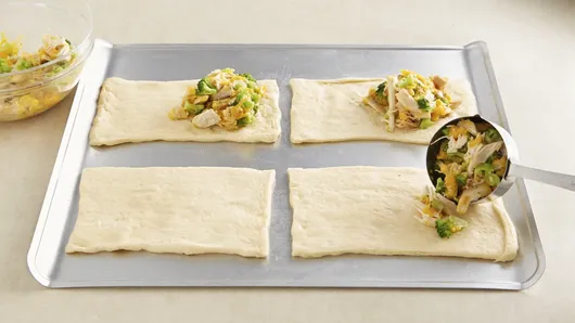 Step2Unroll dough; cut into 4 (6x4-inch) rectangles. Place dough rectangles on ungreased cookie sheet. Top half of each short side of rectangle with about 1/2 cup broccoli chicken mixture.