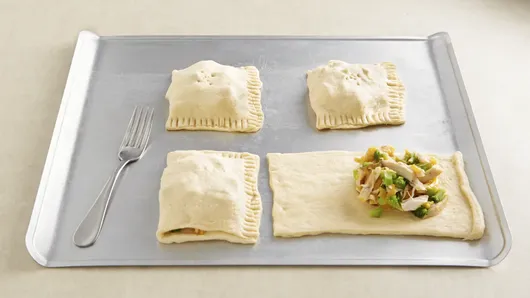 Step3Fold dough over filling, firmly pressing edges with fork to seal. With fork, prick top of each foldover to allow steam to escape.
