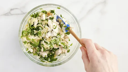 Step1Heat oven to 375°F. Line large cookie sheet with cooking parchment paper. In small bowl, mix spinach, chicken, cream cheese spread, mozzarella cheese and artichokes.