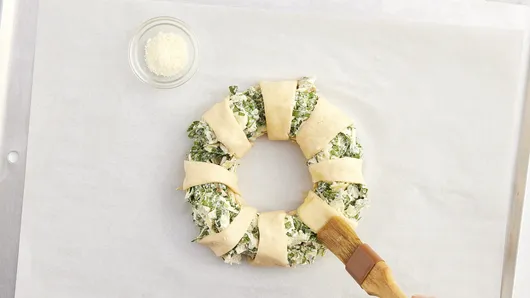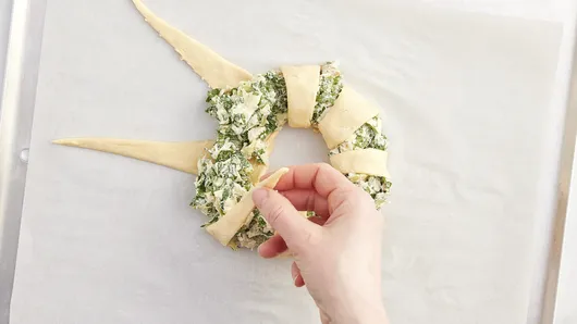Step4Bring each dough triangle up over filling, tucking dough under bottom layer of dough to secure it. Repeat around ring until entire filling is enclosed (some filling will show a little).