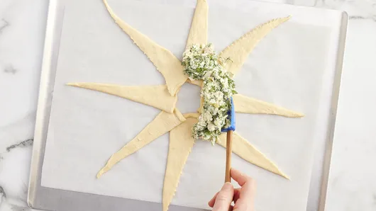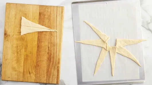 Step2Unroll dough; separate into 4 triangles. Cut each triangle in half lengthwise to form 8 triangles. On cookie sheet, arrange triangles in ring so short sides of triangles form a 2-inch circle in center. Dough will overlap. Dough ring should look like the sun.