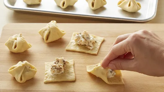 Step3Divide chorizo mixture evenly on center of each dough square. Bring 4 corners together to overlap slightly in center at top of each bundle. Twist and pinch to seal, leaving small gaps between seams. Place on large ungreased cookie sheet.