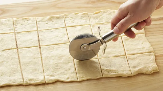 Step2Unroll dough on work surface. Press into 12x8-inch rectangle. If using crescent roll dough, firmly press perforations to seal. With pizza cutter or sharp knife, cut into 6 rows by 4 rows to make 24 squares.