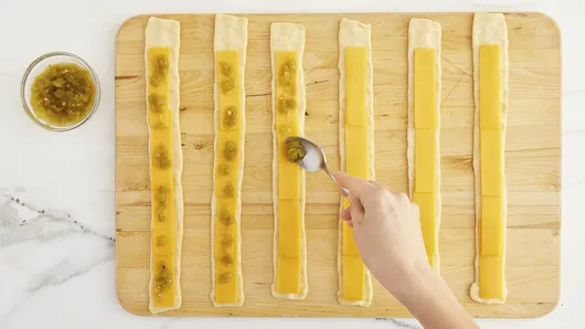 Step3Cut each cheese slice into 4 strips. Top buttered side of 1 dough strip with 4 cheese strips, overlapping slightly if necessary, and leaving 1 inch of one end uncovered to seal. Top cheese layer with about 1 1/2 teaspoons of the remaining green chiles.