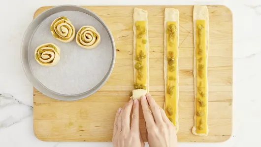 Step4Starting with strip end opposite uncovered end, roll dough back into swirled round, sealing end of dough; place in pan. Repeat for remaining dough, cheese and green chiles. Brush tops of dough with remaining melted butter.