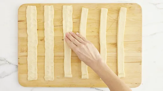 Step2Remove dough from can, and separate into 6 rounds. Unroll each round into dough strip (about 12 inches long) and press strip to 1 1/2 inches wide; brush inside of each unrolled dough strip, using up half of the melted butter.