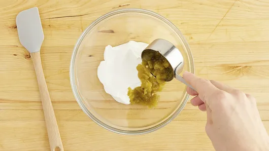 Step1Heat oven to 375°F. Line 9-inch round cake pan with cooking parchment paper. In small bowl, mix 1/4 cup of the green chiles and the sour cream; cover and refrigerate.