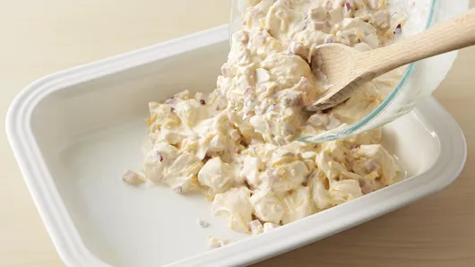 Step3Separate dough into 8 biscuits; cut each into sixths. Gently stir into cream cheese mixture; stir in chicken, ham and onion. Spoon into baking dish.