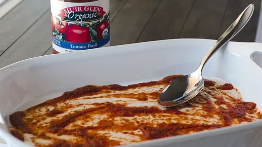 Step1Heat oven to 350° F. Spray 13 x 9-inch (3-quart) baking dish with cooking spray. Spread 1/2 cup sauce from 1 jar (25.5 oz) Muir Glen™ organic tomato basil pasta sauce in bottom of baking dish. Set aside.