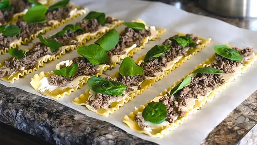 Step3Spread 1 oz from 1 package (8 oz) cream cheese, softened, down center of each lasagna noodle. Divide beef evenly among noodles, placing over cream cheese. Top each with 4 spinach leaves (from 2 cups baby spinach leaves).