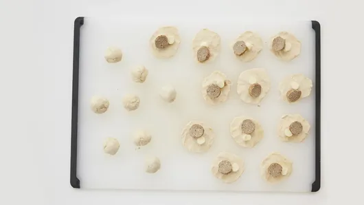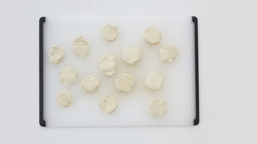 Step1Heat oven to 375°F. Separate dough into 10 biscuits. Separate each biscuit into 2 layers. Press each biscuit layer into 3-inch round.